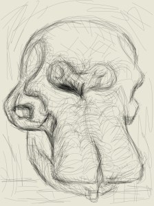 I selected a number of drawings by Henry Moore and tried to copy them faithfully using digital means, the first of which is a lithograph print of an elephant skull (black and white):