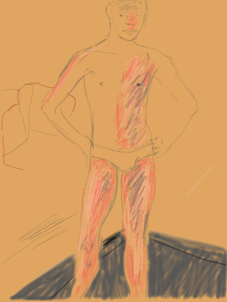 Another drawing I copied is a graphite, crayon and watercolour drawing on gold paper of a young man in his tighty-whiteys, “Boy” by David Hockney (who also has recently become enraptured by using an iPad himself for vibrant landscapes of his home in Yorkshire).
