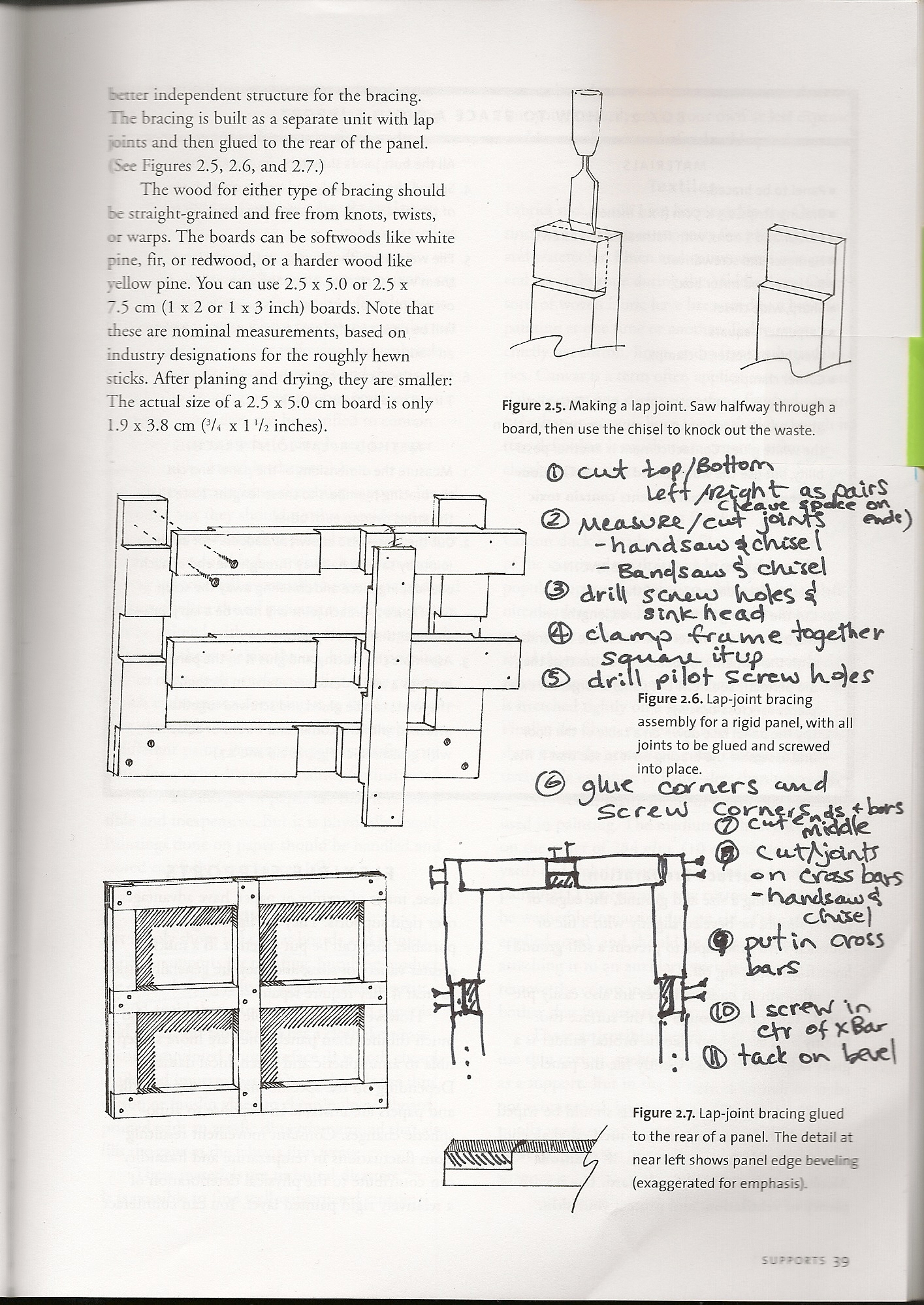 - Fit the cross bar(s) onto the stretcher frame, drill two pilot holes in each lap joint, apply wood glue to each joint, and screw the lap joints together – EXCEPT for the centre lap joint, do NOT apply glue and drill in the centre screws LAST. (This allows for adjustments later).