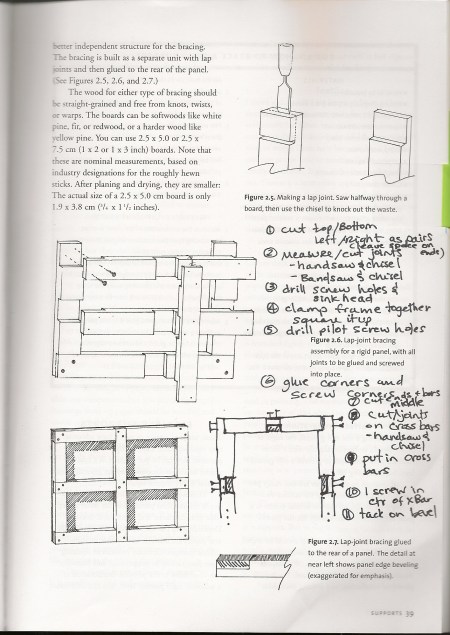 - Putting the cross-bars aside for now, measure, adjust the layout of pieces as necessary and mark on each plank where the correct length should be and also where the lap joints will be