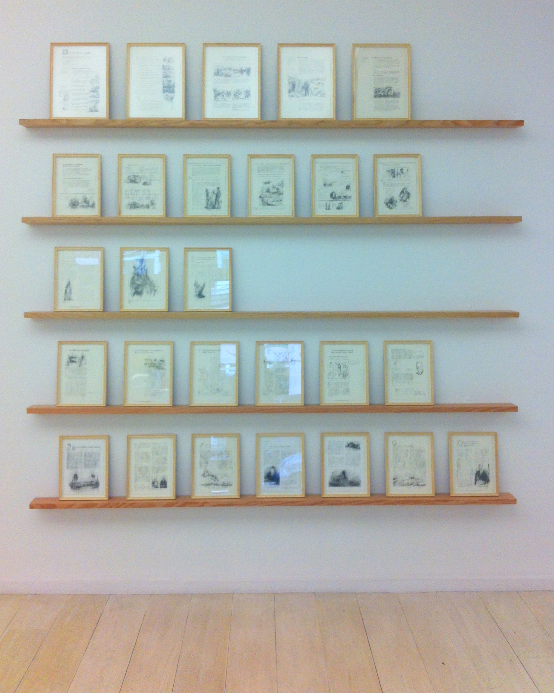 The third artist participating in the panel, Ruth Goddard, is a native South African, shows a few of her drawings and works on paper, in which she re-examines memories from childhood as apartheid was coming to an end. “A Persistent History” (2011-2012) is a work where she looks at how history and subsequently, the history textbook is rewritten in the wake of the transition from apartheid to a more cohesive state. The partially erased drawings of textbook pages try to “define a chronological and accepted narrative” (from exhibition guide) as they reveal how the past is lost as new histories are written.