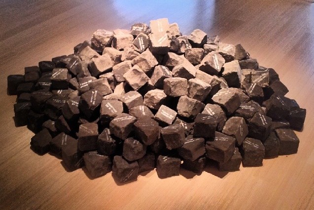 Pinczehelyi continually utilises well-known symbols of the international workers’ movement (the star, hammer, sickle and cobblestone) to define his “…personal position within the historical and cultural reality of Central and Eastern Europe”. In his well-known cobblestone piece (header image of this post), one must get closer to read on each stone the words “The Weapon of the Proletariat” written in English, French and Italian. With deep historical and political reference, this work could be be read in a number of ways, e.g., about either the suffering of the labour force (downtrodden by The Man) or violence by the workers (throwing stones in protest of their rights) and so on. And the work is still relevant today with the 99%/1% and Occupy movements, as poverty continues to crush much of the world’s population.