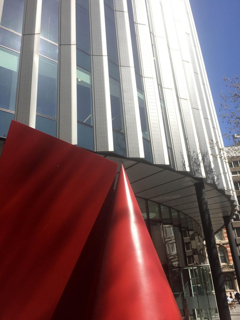 The first artwork we found included in SITC was the pair of works with interlocking rings by Nigel Hall, which seemed to work perfectly next to the black-and-steel Lloyd’s building with its “inside-out” architecture.