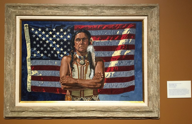 Robert Tannenbaum, ‘Grey Wolf’, 1984, casein on masonite, at Booth Western Art Museum, Cartersville, GA. Photo credit Kelise Franclemont. The card reads: Robert Tannenbaum was an award-winning illustrator before turning to easel painting. This Native American portrait shows a defiant Plains Indian with arms folding in front of an American flag, perhaps expressing the struggle for success many Indians face in the modern world.’