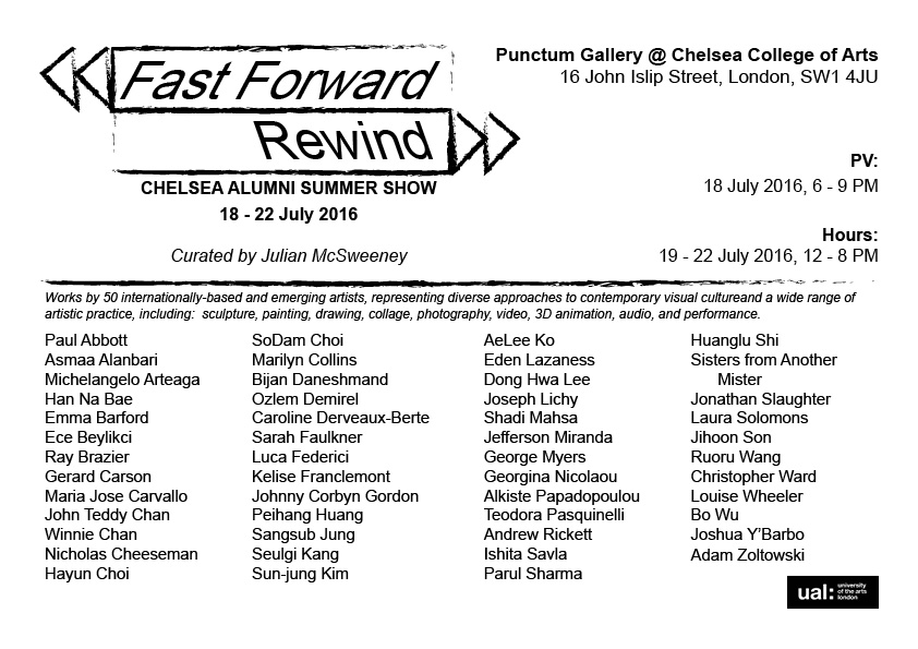 20-second sneak-peek: 50 recent alumni of the MA Fine Art course at Chelsea College of Arts come together again for “Fast Forward/Rewind”, a show curated by 2015 graduate Julian McSweeney. From 18 to 22 July 2016 in the Punctum Gallery @ Chelsea College of Arts, London, private view: 18 July 2016, 6:00 to 9:00 PM.