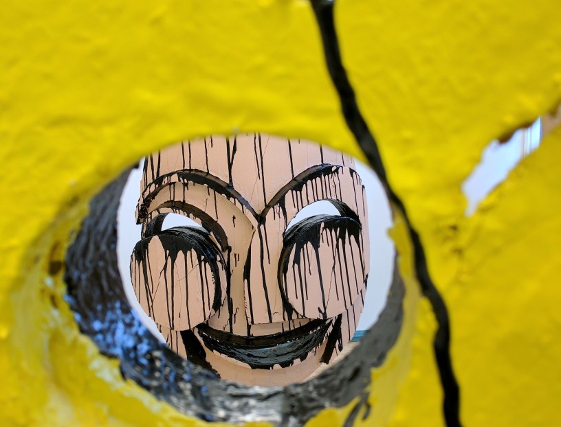 Four faces (or masks) make up this solo show, three bearing human resemblance as “portraits” (of the artist himself or of Monika, a friend and recent creative collaborator). Two of these heads are astride wooden boxes, giving them “bodies” with dual function: as the shipping crates they arrived in and the plinths to elevate them from the ground. The fourth mask, a graphic depiction of the Eqyptian god of the afterlife, Anubis, seems to levitate a few inches off the floor and silently broods his belonging in the quartet as he looks on to a smiling “Portrait of Monika”.