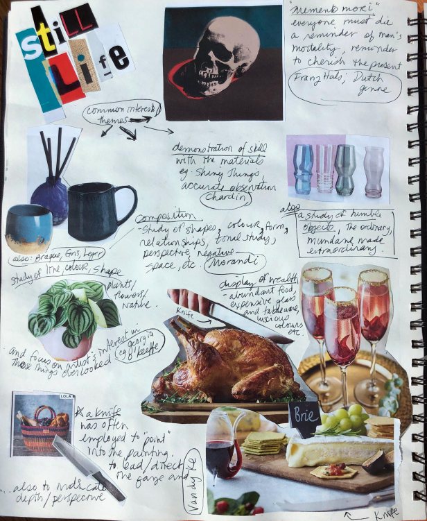 Now a confession: I couldn’t really bring myself to spend much time on the “still life” section. I more often than not find this subject deadly dull, and so as not to miss out, I made a collage picking elements from supermarket catalogues and tried to make note of the most salient details Hodge presented for the chapter. That said, I do enjoy a good skull which appears in Dutch still life paintings galore as a ‘memento mori’ (i.e., a reminder everyone dies, and to cherish the present… a good thing to bear in mind these days). But one object I’ve rarely noticed is the giant knife that traditional still life painters almost always put in the composition. What the heck is that about? Well, knives make a POINT of leading the viewer into the image, kind of like saying in today’s lingo, “Click HERE to begin downloading this painting into your mind”.