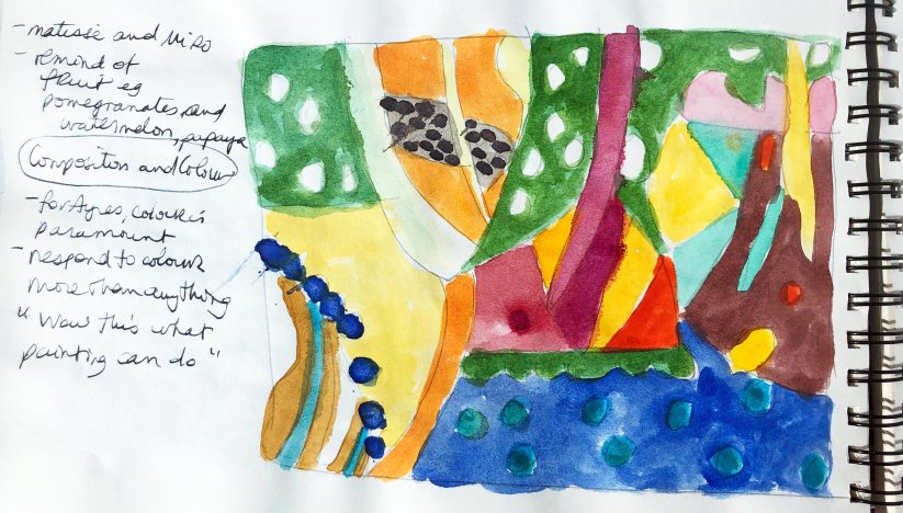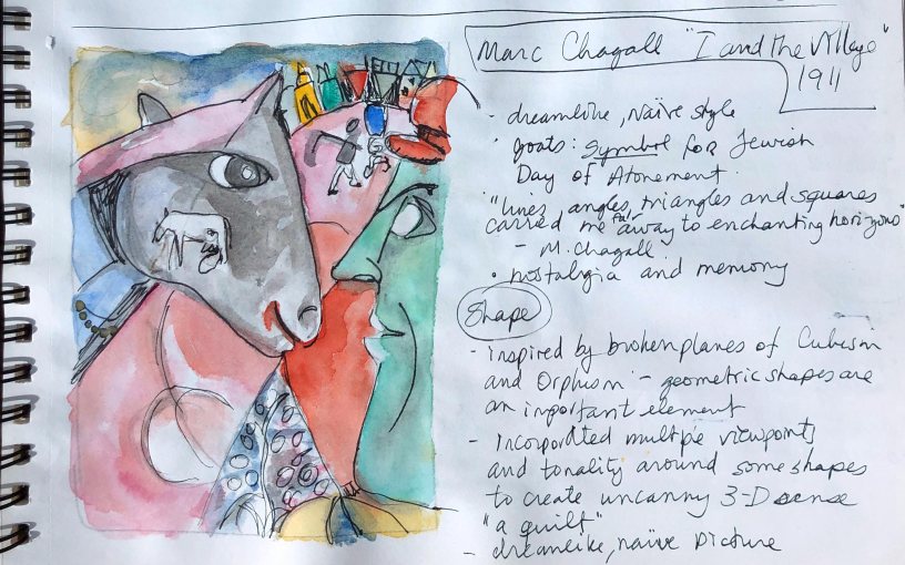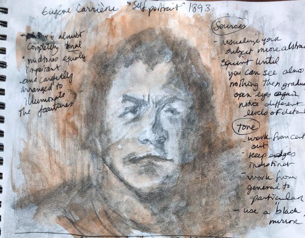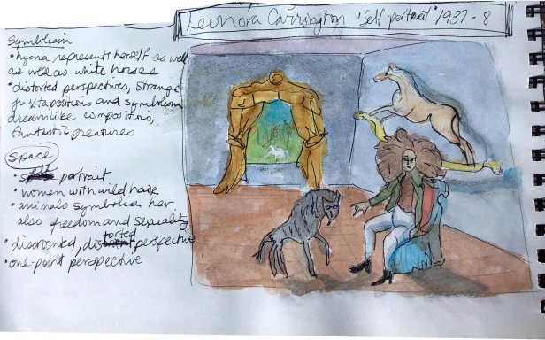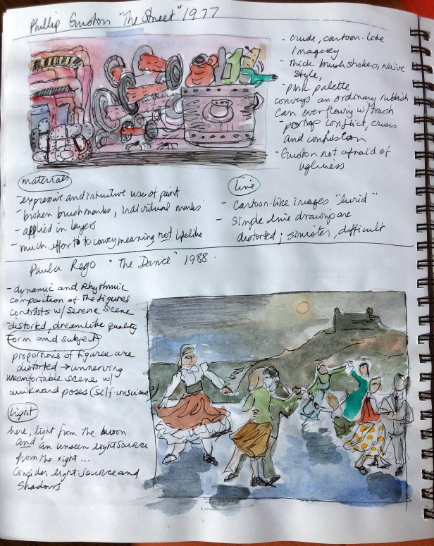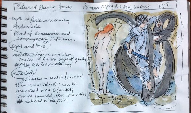 So a few months ago (pre-COVID quarantine 2020), I had found Painting Masterclass in one or another of Tate’s bookshops, cleared a space on my kitchen table and started to work through the book, with a few visits to National Gallery, Tate Britain/Modern and others to look at actual paintings. I aimed for “sketching reviews”, an active process that is slowed beyond reading, helping me learn more deeply, as I spent over 30 minutes, pen to paper, to really scrutinise each image. In my sketchbook I used (mostly) ink, graphite, and watercolour (as this dries quickly). Maybe later I’ll revisit some of what I learnt, with acrylic, oils, and other materials to try some of the techniques more closely aligned to what the artist did.
