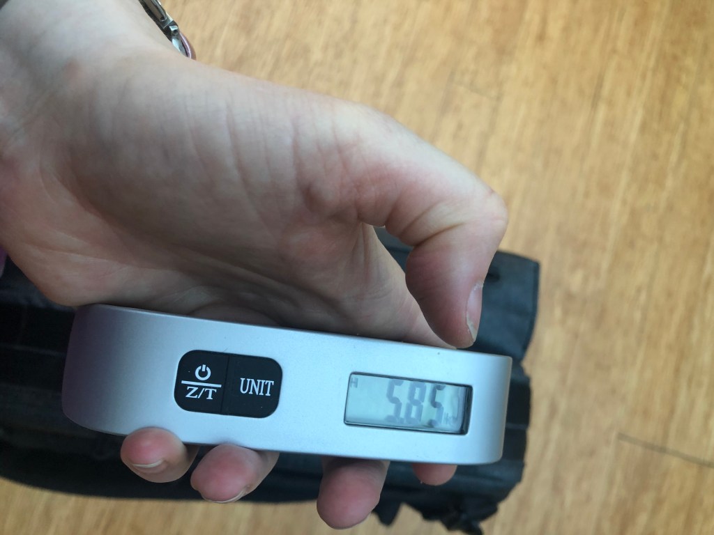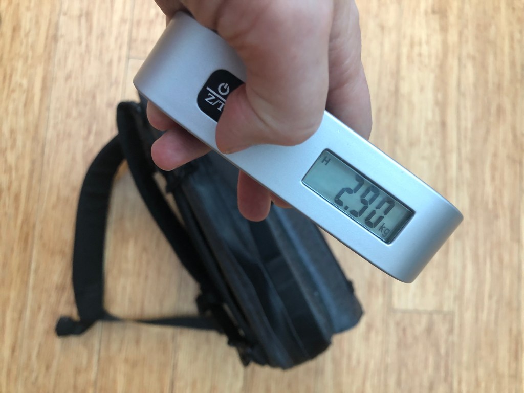After removing the Etchr tripod panel, a mesh bag, and the extra insert panel, the bag shed about 500 grams: 2.4 kg (5.4 lbs)