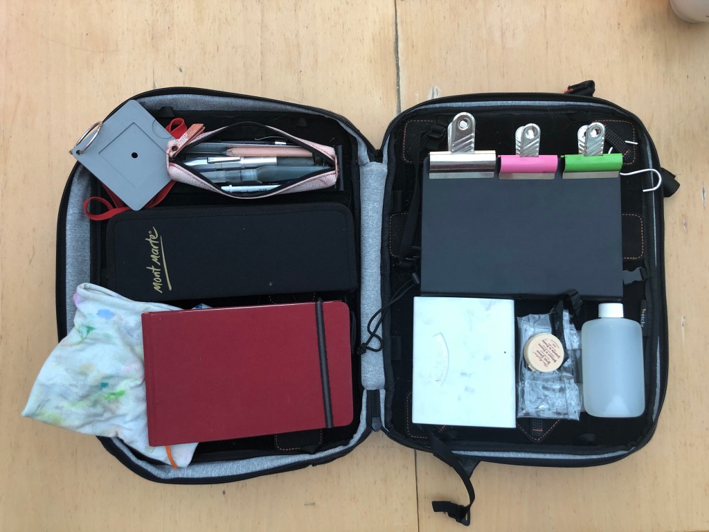 Planning an afternoon of field sketching and watercolour study, I put in a the relevant supplies that I would use at home. Essentials like house keys, phone, wallet, hand sanitiser, mask, etc. are in my jacket pocket for now. As I said above, the Etchr art satchel is super easy to organise the contents to suit my own needs and preferences, with all the elastic bands, velcro “tiles”, clips, loops, and pockets that are included.