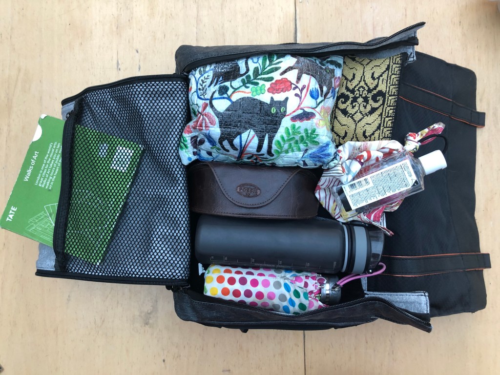 So then I packed for, say, going further afield (such as to draw on Southbank) travelling on public transport or by bicycle. (Don’t forget your mask!)