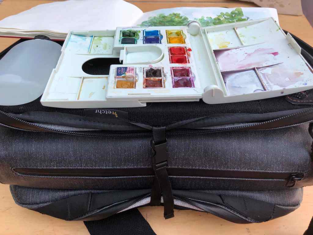 The Etchr Art Satchel showed up on Kickstarter (around £180 if memory serves) about 3 years ago [2016-17], so I bought one with the idea to take it with me to China on a 3-week tour, after which I planned to use it as a “studio in the go” when I was out and about sketching in London. This pandemic has finally afforded me some time to try it out…
